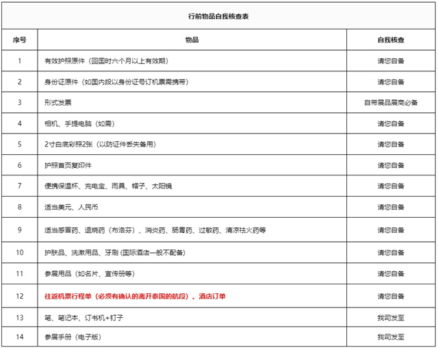 特別提醒:一定要隨身攜帶有效護(hù)照原件(護(hù)照有效期須在回國(guó)日期后至少有六個(gè)月有效期)、機(jī)票行程單(必須有確認(rèn)的離開泰國(guó)的航段)、酒店訂單入境泰國(guó)。